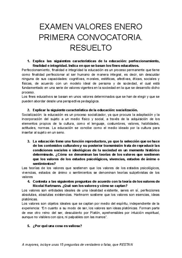 EXAMEN VALORES ENERO PRIMERA CONVOCATORIA. RESUELTO Hay dos modelos de examen, uno por cada grupo, pero son muy similares, pregunta lo mismo pero otras etapas...