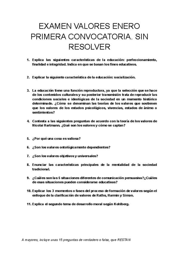 EXAMEN VALORES ENERO PRIMERA CONVOCATORIA. SIN RESOLVER