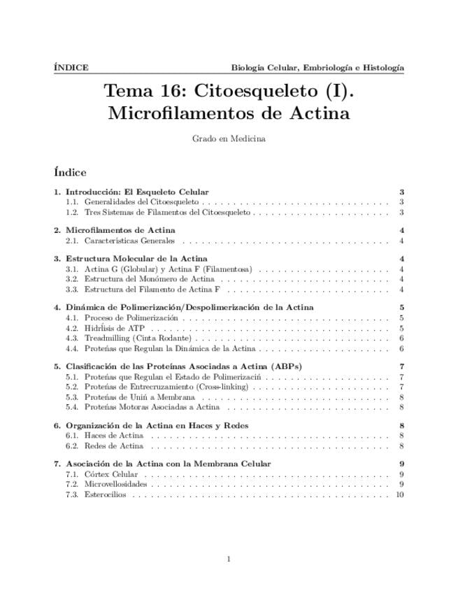 Tema 16. Citoesqueleto (I). Microfilamentos. Características generales y componentes del citoesqueleto. Estructura molecular de los microfilamentos. Dinámica de polimerización / despolimerización. Clasificación general de las proteínas asociadas a actina.