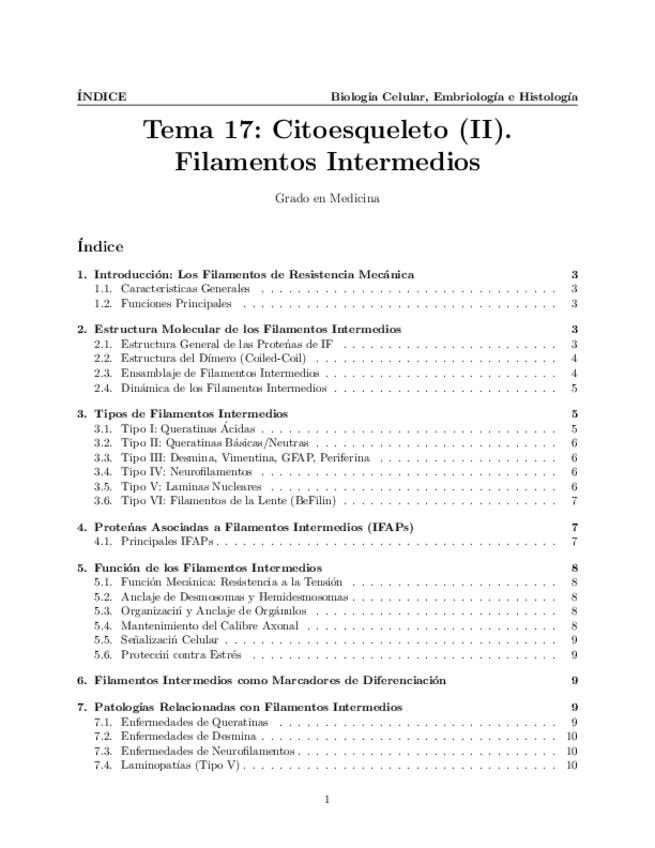 Tema 17. Citoesqueleto (II). Filamentos Intermedios. Estructura molecular. Polimerización. Tipos de filamentos intermedios. Proteínas asociadas. Función.