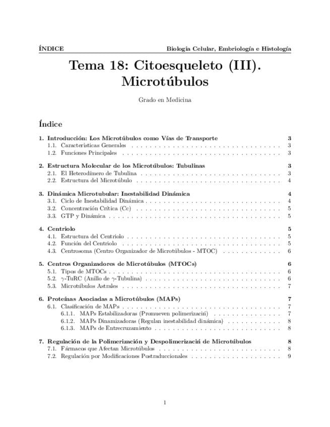 Tema 18. Citoesqueleto (III). Microtúbulos. Estructura molecular de los microtúbulos: tubulinas. Dinámica microtubular. Centriolo. Centros organizadores de microtúbulos. Proteínas estructurales asociadas a microtúbulos. Regulación de la polimerización y d