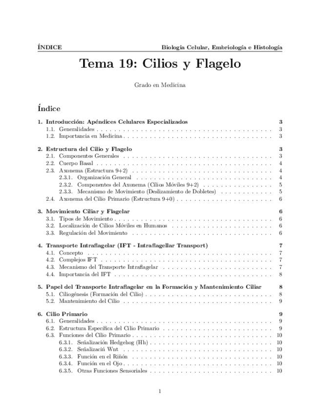 Tema 19. Cilios y Flagelo. Generalidades. Estructura y movimiento. Transporte intraflagelar: papel en el formación y mantenimiento de la estructura ciliar y flagelar. Cilio primario.