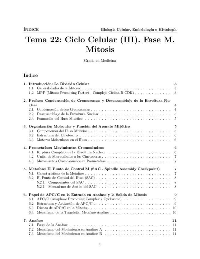 Tema 22. Ciclo Celular (III). Fase M. Mitosis. Profase: condensación de los cromosomas y desensamblaje de la envoltura nuclear. Organización molecular y función del aparato mitótico. Prometafase: movimientos cromosómicos. Metafase: El punto de control M.
