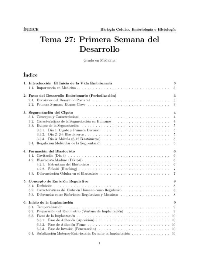 Tema 27. Primera Semana del Desarrollo. Fases del desarrollo embrionario. Segmentación del cigoto. Formación del blastocisto. Concepto de embrión regulativo. Inicio de la implantación.