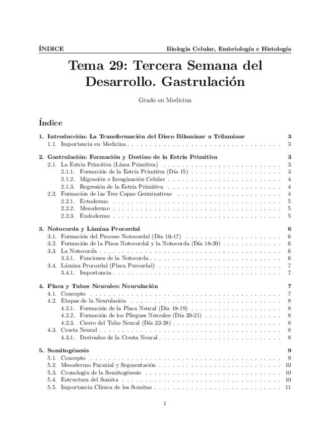 Tema 29. Tercera Semana del Desarrollo. Gastrulación: formación y destino de la estría primitiva. Notocorda y lámina procordal. Placa y tubos neurales. Somitogénesis. Derivados de las hojas germinativas.