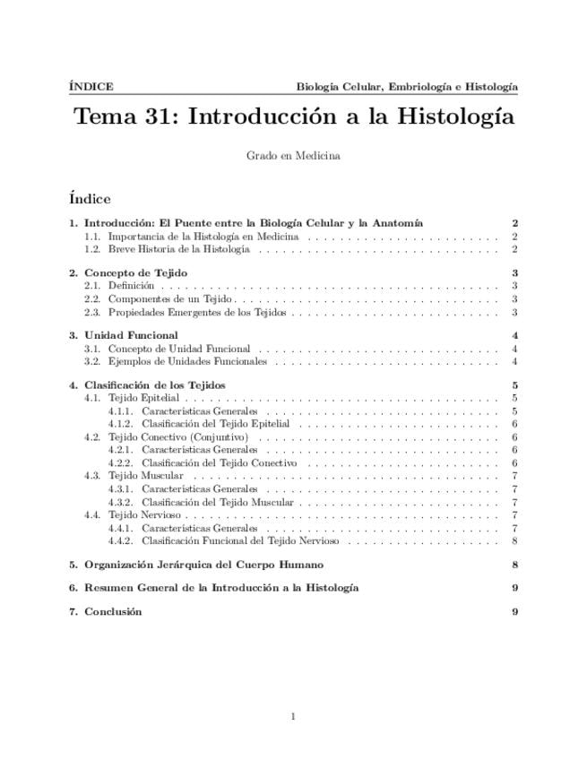 Tema 31. Introducción a la Histología. Histología: Concepto. Tejido: Concepto. Unidad funcional. Clasificación.