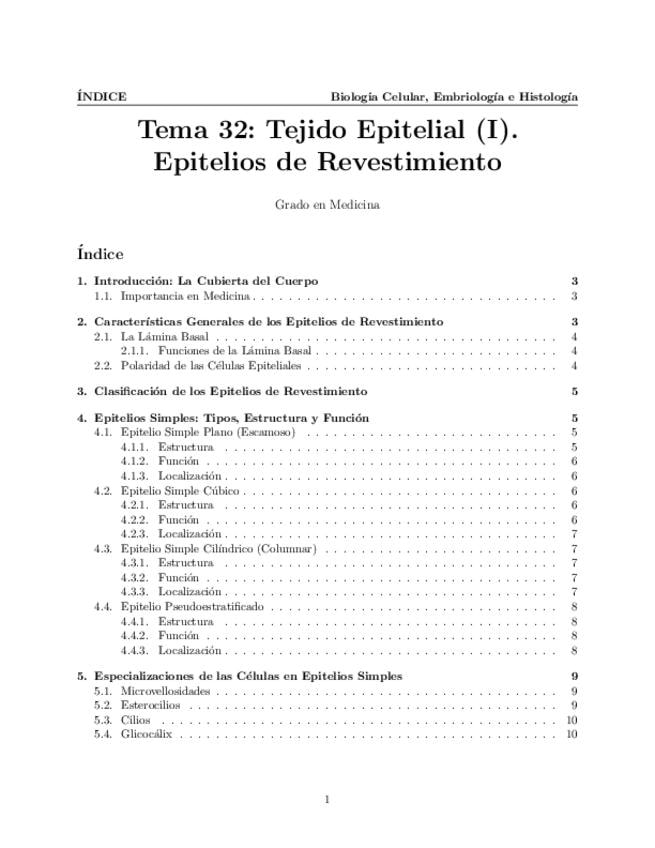 Tema 32. Tejido Epitelial (I). Epitelios de revestimiento. Características generales. Clasificación. Epitelios simples: tipos, estructura y función. Especializaciones de las células en los epitelios simples. Epitelios estratificados: tipos, estructura y f