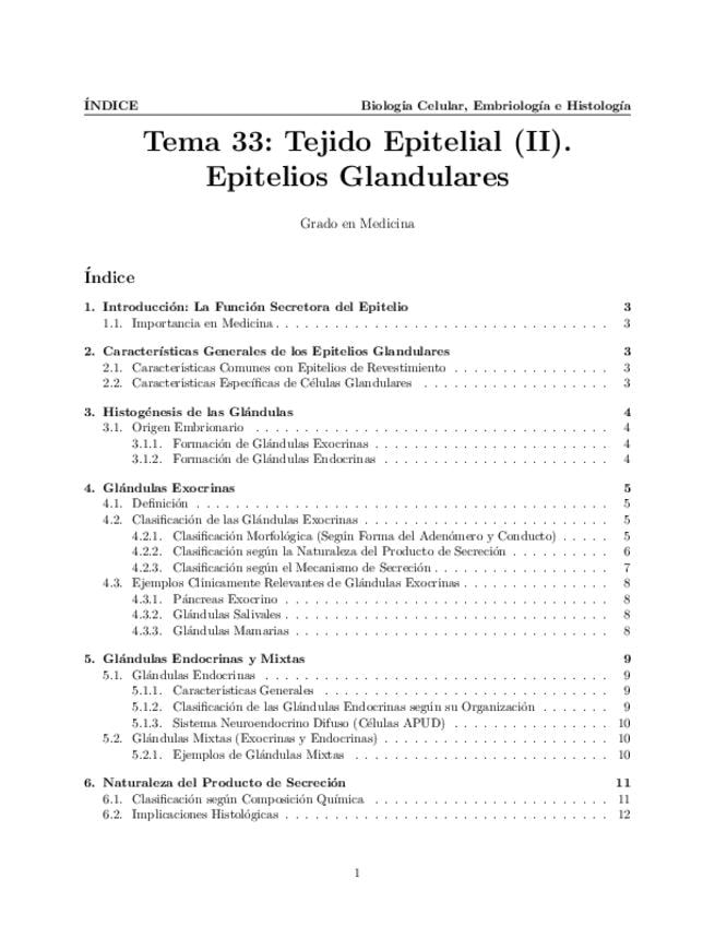Tema 33. Tejido Epitelial (II). Epitelios glandulares o secretores. Características generales. Histogénesis. Glándulas exocrinas. Glándulas endocrinas y mixtas. Morfología y clasificación. Naturaleza del producto de secreción. Mecanismos de secreción.