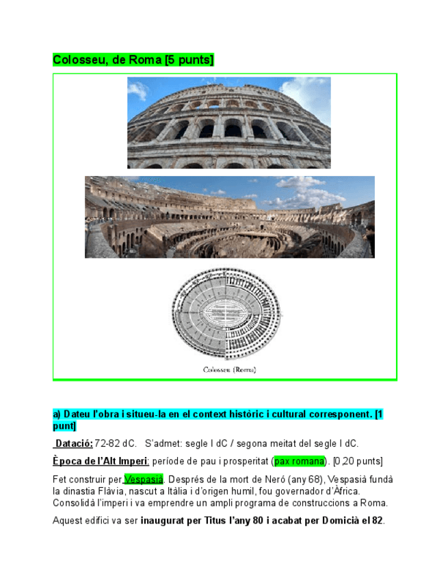 En este documento PDF se encuentra un resumen completo del Coliseo de Roma. Es un ejercicio tipo examen con todo lo que se necesita responder para sacar la máxima nota. Incluye puntos clave del análisis, el contexto, características... ¡Es un resumen cla