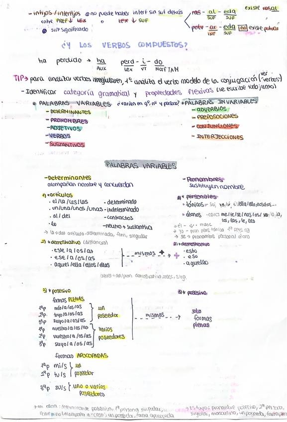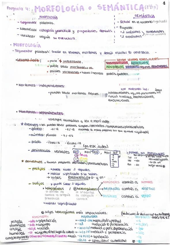 Resumen con lo necesario para realizar morfología: segmentar palabras en lexemas y morfemas, identificar categoría gramatical ("sustantivo, común, abstracto) y clasificar según su estructura (simples, derivadas, compuestas y parasintéticas...). Incluye