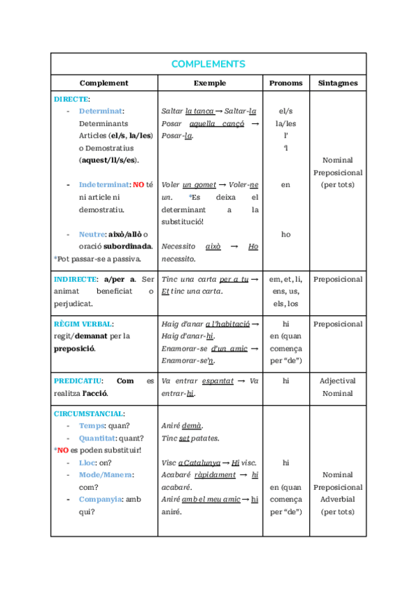 Taula resum amb el Complements, els seus Pronoms i la Combinació.