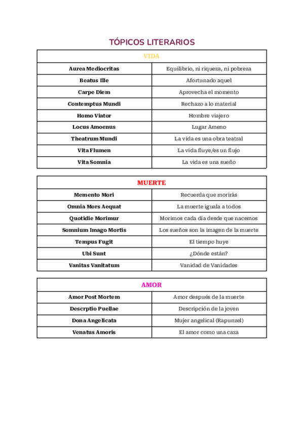 Tabla Resumen de los tópicos literarios. 2 de Bachiller 2025