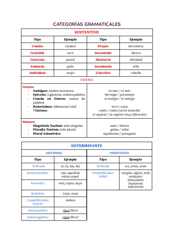 Resumen de las categorías gramaticales y todos sus tipos. 2º Bachillerato 2025