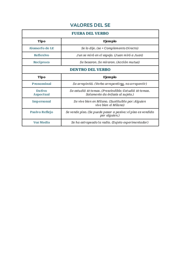 Tabla resumen con ejemplos de los valores del SE. Castellano 2º Bachillerato 2025