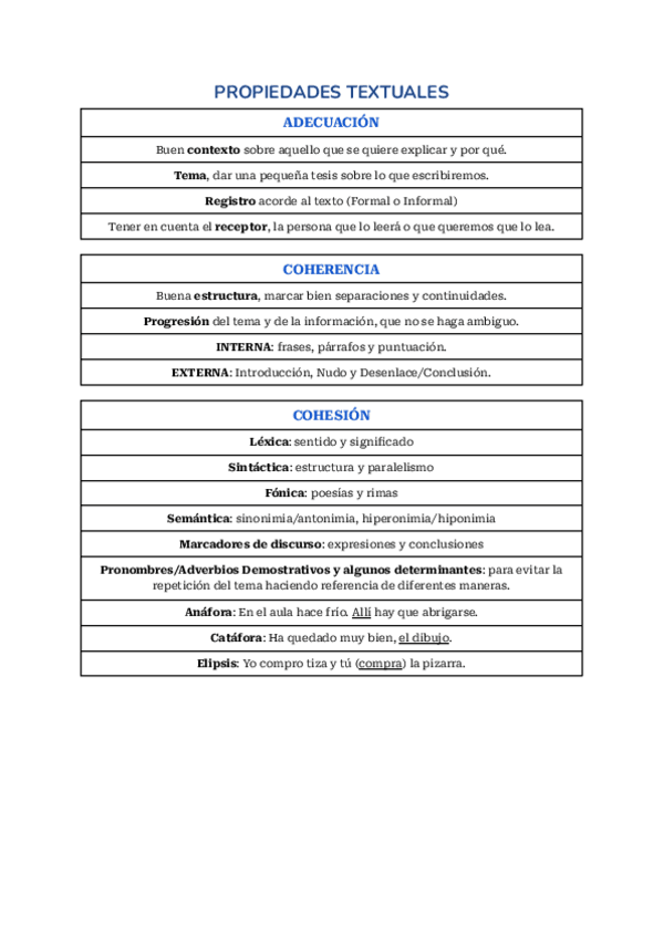 Resumen de las propiedades textuales para hacer un buen texto. Castellano 2º Bachillerato 2025.