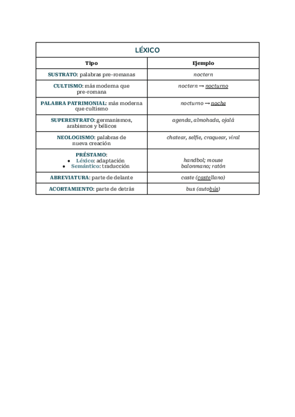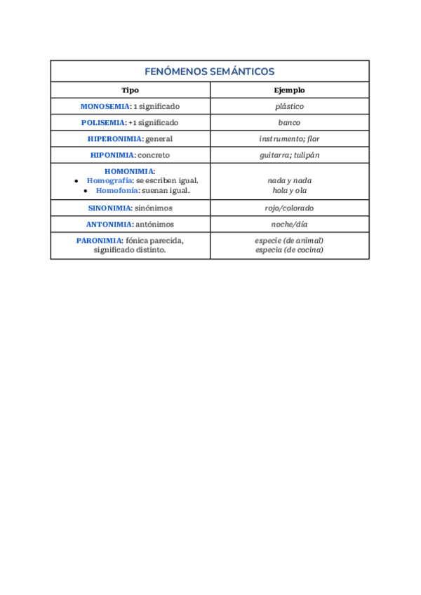 Tabla resumen de los fenómenos semánticos. Castellano bachillerato 2025