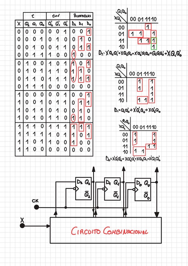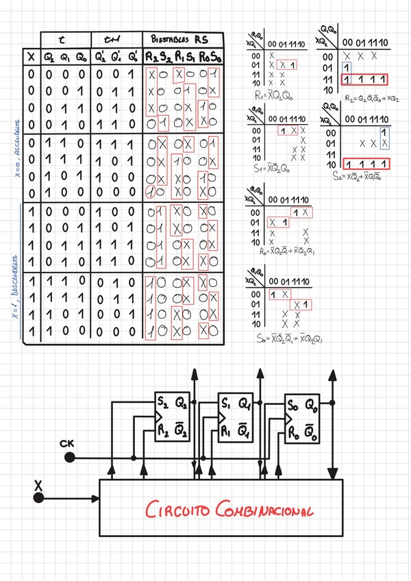 Contador Síncrono ascendente/descendente en código Gray de tres dígitos, utilizando biestables RS con sincronismo por flanco de subida.