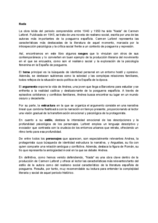 Esquema con toda la información relevante para la lectura de la PAU sobre "Nada" de Carmen Laforet