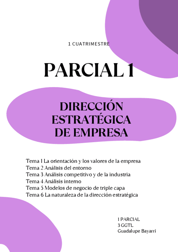 Tema 1 La orientación y los valores de la empresa, tema 2 Análisis del entorno, tema 3 Análisis competitivo de la industria, tema 4 análisis interno, tema 5 modelos de triple capa, tema 6 la naturaleza de la dirección estratégica