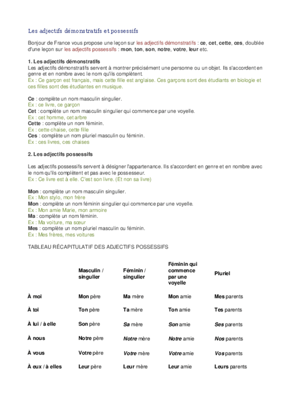 Les adjectifs démonstratifs et possessifs APUNTES COMPLETOS FRANCES Adjetivos demostrativos y posesivos