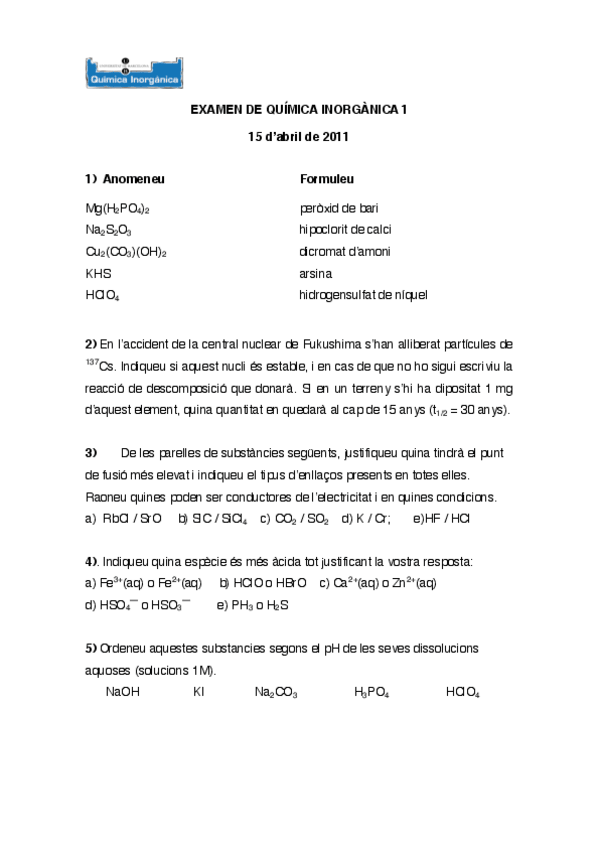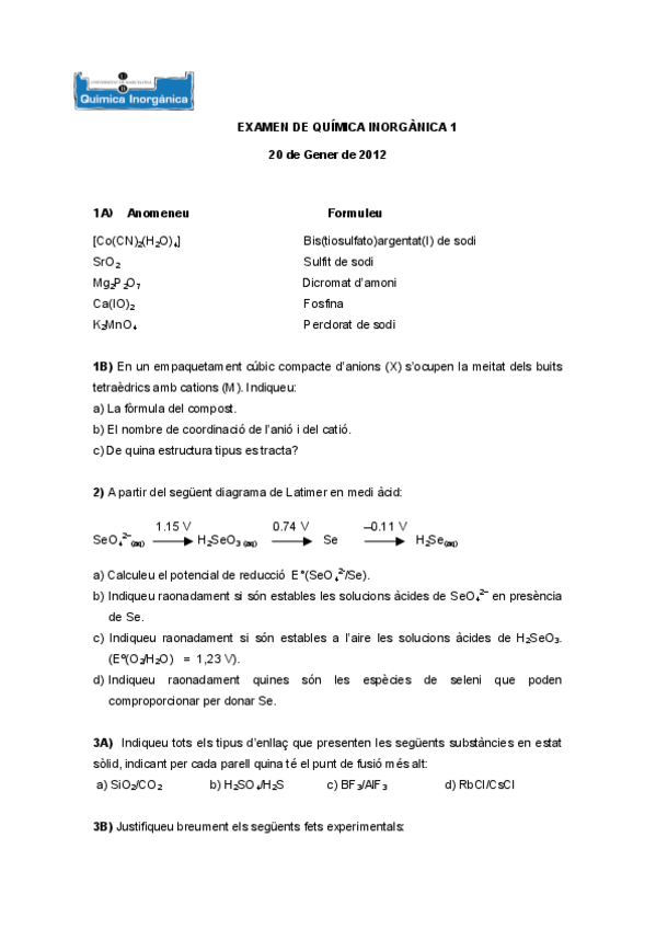 He publicado nuevos examenes de 2º Química Inorgánica I: Examen-gener-2012.pdf