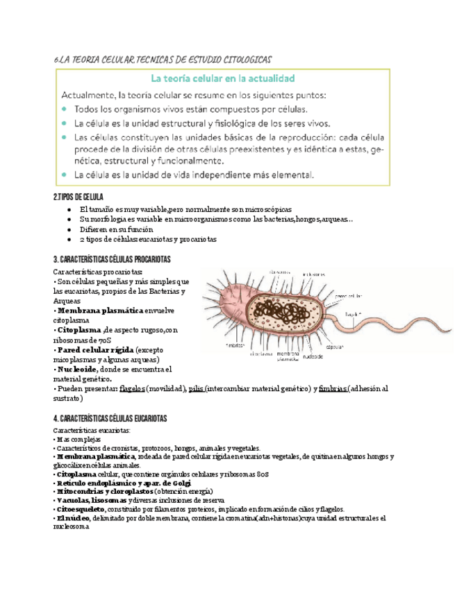 Este documento resume de forma clara y ordenada los conceptos esenciales sobre la teoría celular y las técnicas de estudio citológicas. Incluye explicaciones sobre los tipos de células (procariotas y eucariotas), sus características, orgánulos y funciones