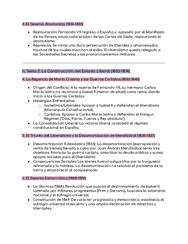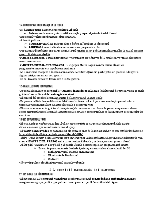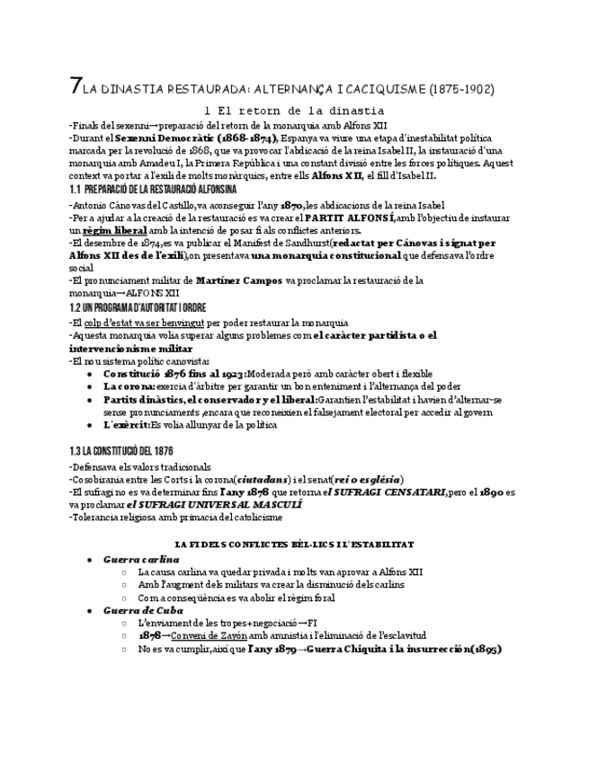 Aquest document és un resum complet i clar sobre el període de la Restauració borbònica a Espanya (1875–1902), centrat en el regnat d’Alfons XII i la regència de Maria Cristina. Explica de manera esquemàtica i fàcil d’entendre com va funcionar el sistema