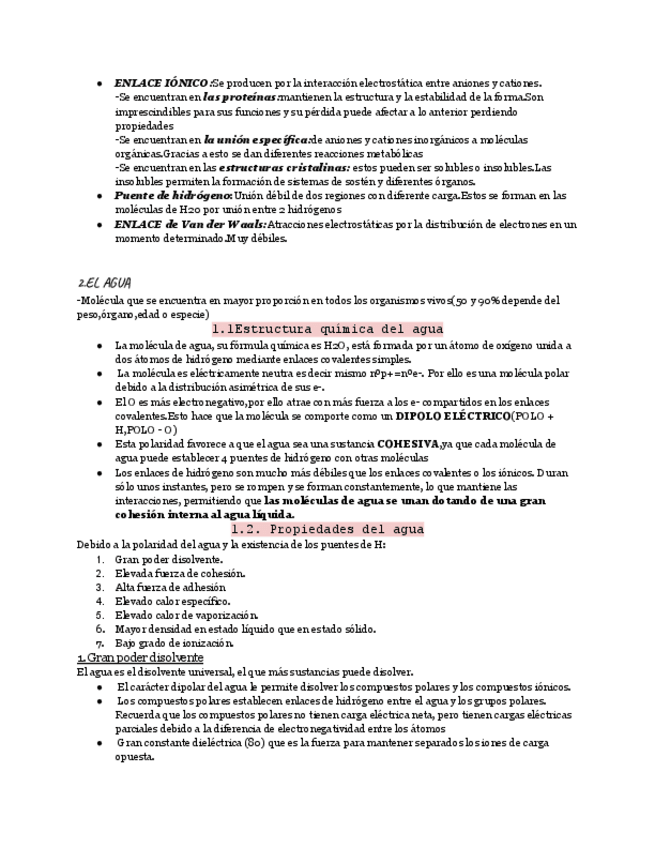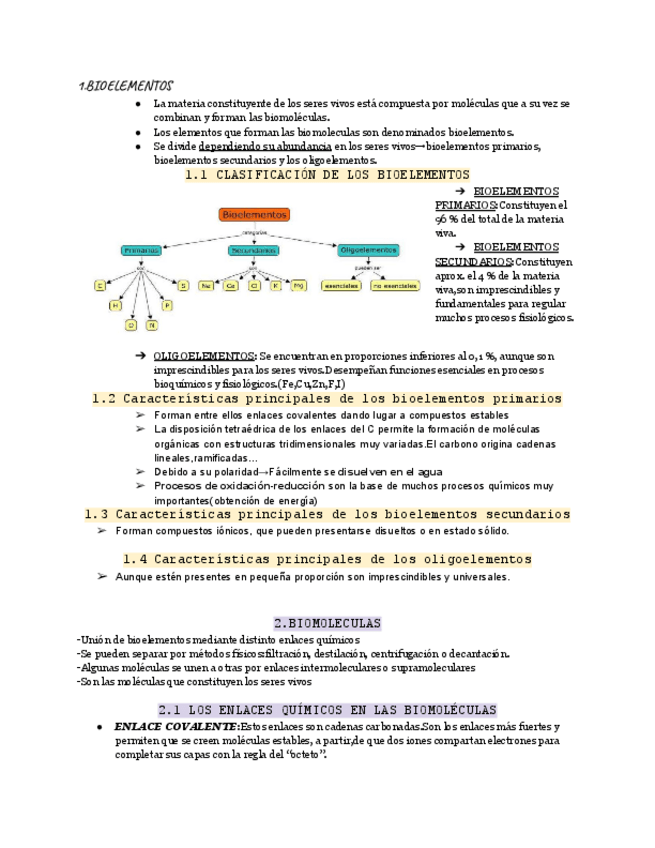 Apuntes completos y organizados sobre los bioelementos y las biomoléculas esenciales en los seres vivos. Explica sus tipos, funciones y propiedades, así como los enlaces químicos, la importancia del agua, las sales minerales y los glúcidos.