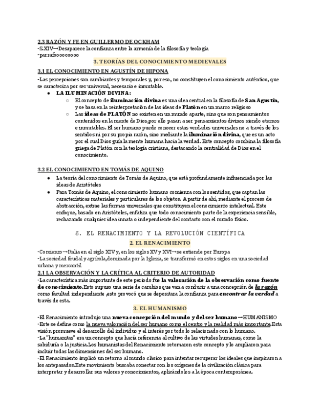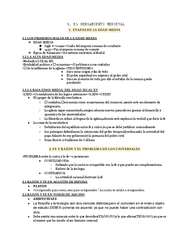 Este resumen abarca la evolución del pensamiento filosófico desde la Edad Media hasta los inicios de la Modernidad. Comienza con el pensamiento medieval, destacando el teocentrismo, las ideas de San Agustín de Hipona y Tomás de Aquino, y el conflicto entr