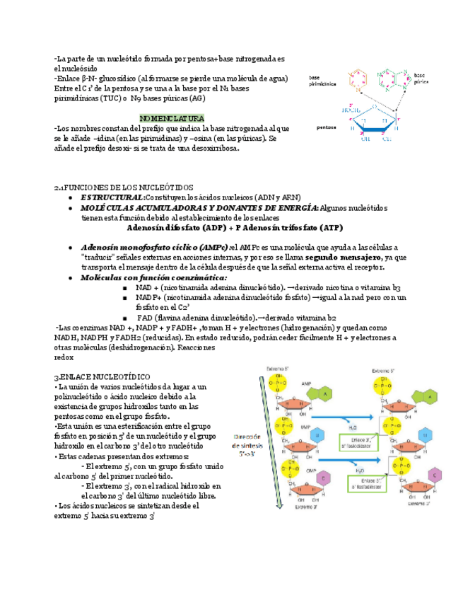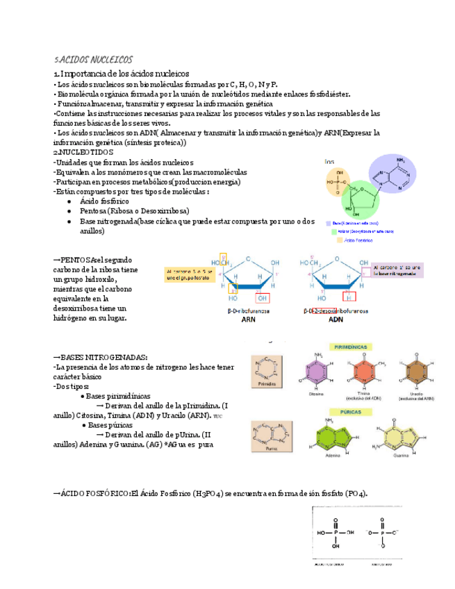 Este resumen explica de manera completa los aspectos esenciales de los ácidos nucleicos, sus estructuras y funciones dentro de los seres vivos. Se detallan los componentes básicos de los nucleótidos —ácido fosfórico, pentosa y base nitrogenada—, así como