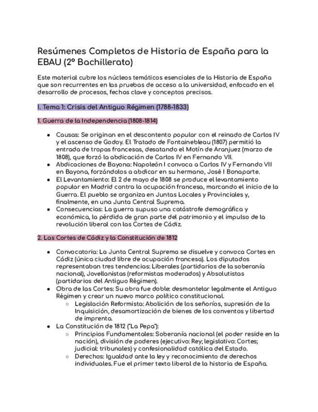 ¿Necesitas dominar la Historia de España desde el Antiguo Régimen hasta la Transición para tu EBAU? Este no es un temario lineal, sino un compendio de apuntes desarrollados punto por punto que te dan la clave para redactar las preguntas de desarrollo con