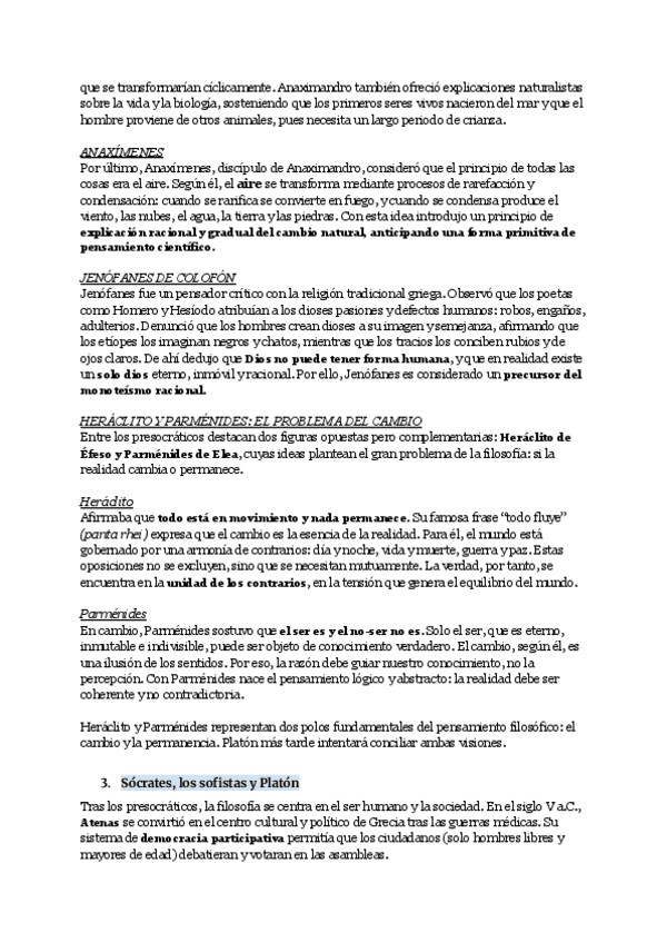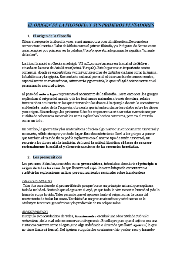 Apuntes del origen de la filosofía (presocráticos, Sócrates, sofistas) desarrollado por apartados