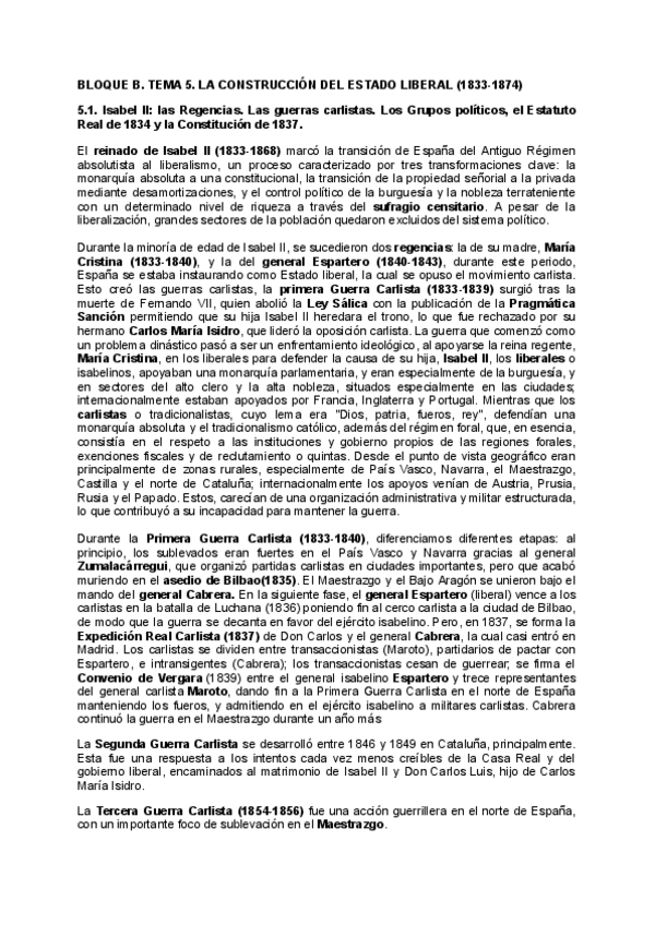 Resumen del bloque B, tema 5: Isabel II-Sexenio Adaptado para la PAU