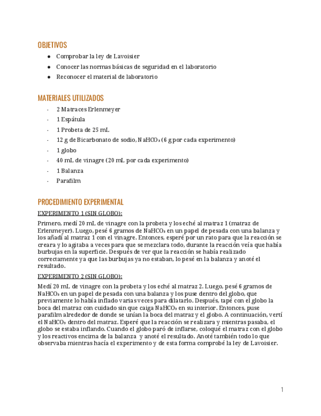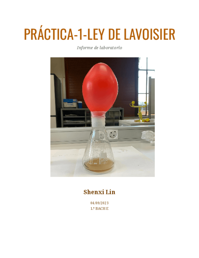 Informe de práctica de laboratorio en 1 bachillerato sobre la ley de Lavoisier