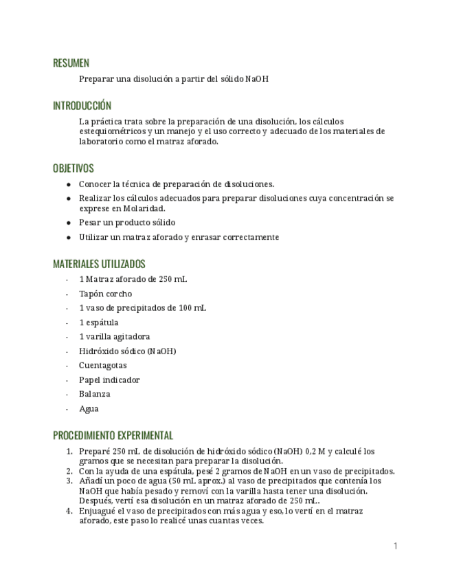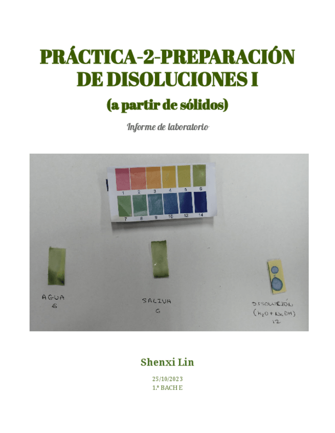 Informe de práctica de laboratorio en 1 bachillerato sobre la preparación de disoluciones a partir de sólidos