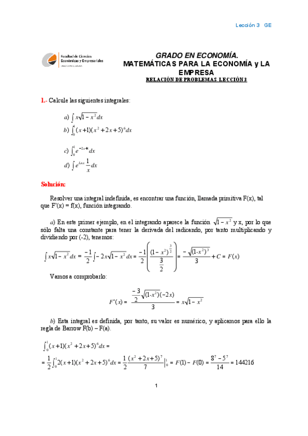 He publicado nuevos ejercicios de 1º Matemáticas para la Economía y la Empresa: Lección 3-Integrales