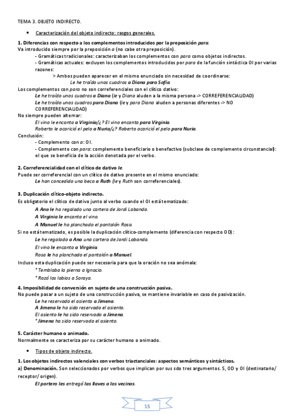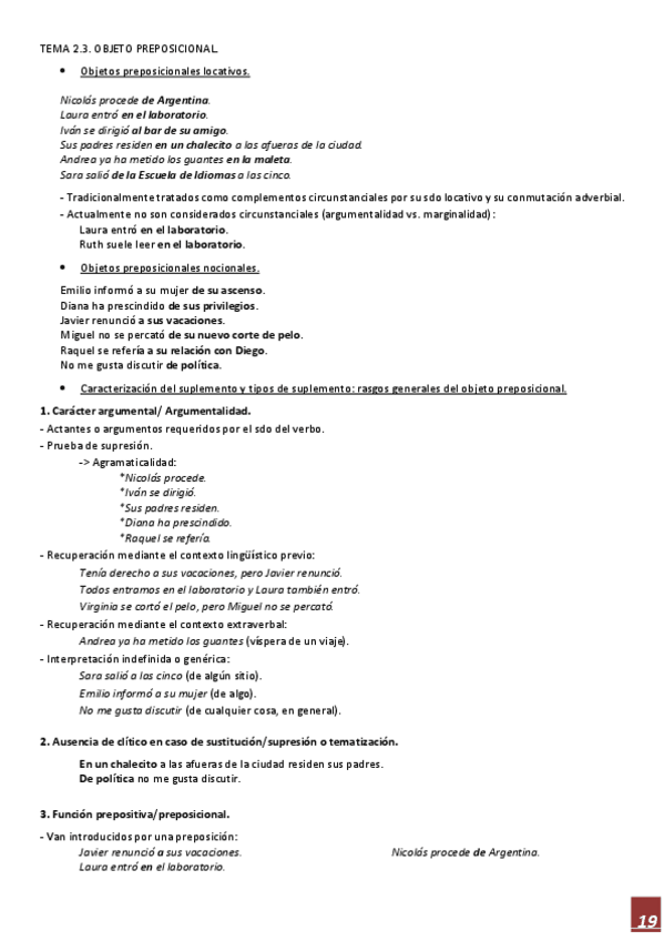 Resúmenes TEMA 1: sujeto y predicado, concordancias y discordancias. TEMA 2: 1,2,3,4 2.1. objeto directo 2.2. objeto indirecto (NO ES TEMA 3, ES TEMA 2.2) 2.3. objeto preposicional 2.4. queísmo y dequeísmo