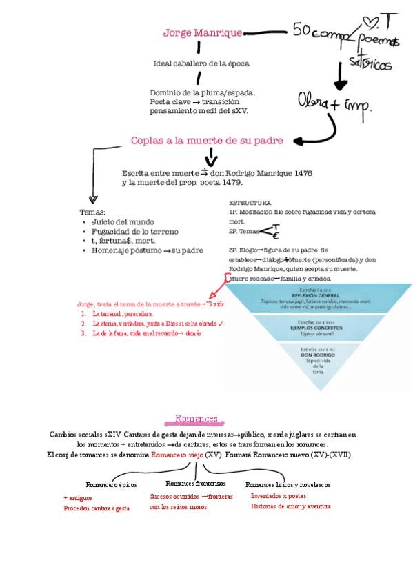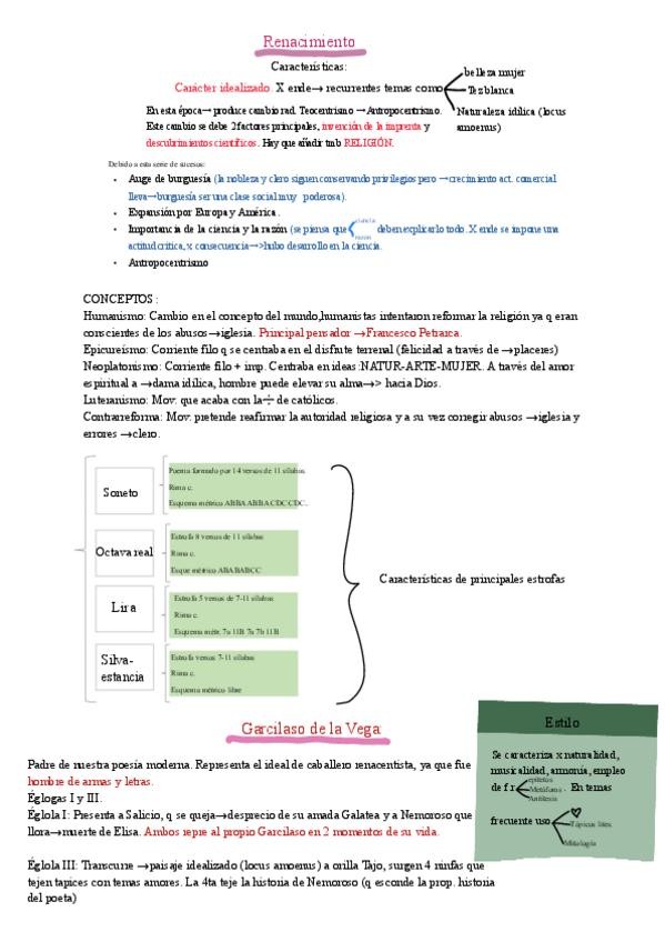 apuntes de literatura, de temas variados (Manrique, celestina, romances, poesía estética y mística, Garcilaso, San Juan de la Cruz, lazarillo, Cervantes y Quijote, renacimiento y etapas en España, novelas de ficción.