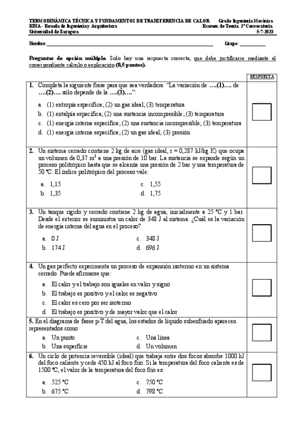 He publicado nuevos examenes de 2º Termodinámica Técnica y Fundamentos de Transmisión de Calor: examen-teoria-julio-2023-resuelto.pdf