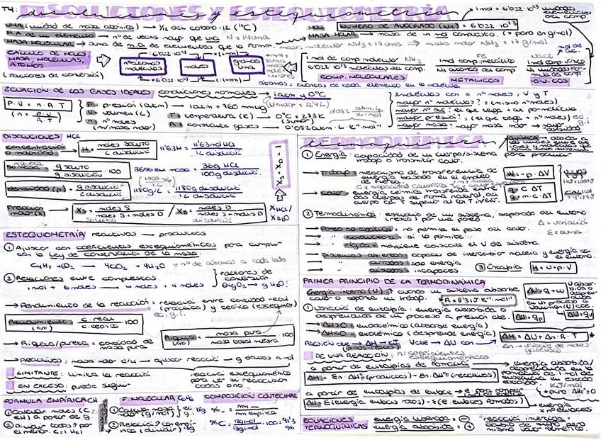 Resumen del tema 4 correspondiente a selectividad de química en dos páginas (se puede resumir aún más), incluyendo disoluciones y estequiometría, termoquímica y cinética química.
