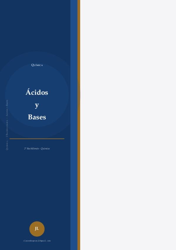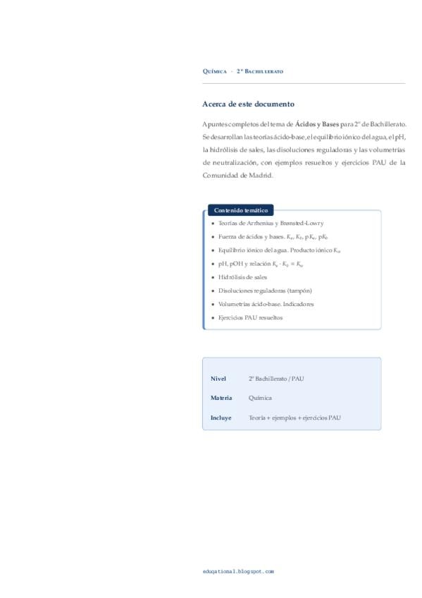 Apuntes sobre ácidos y bases. En ellos se incluyen las teorías ácido-base, la fuerza de ácidos y bases, el equilibrio iónico del agua, los conceptos de pH, pOH y su relación, la hidrólisis de las sales, las disoluciones reguladoras o tampón, y las volumet