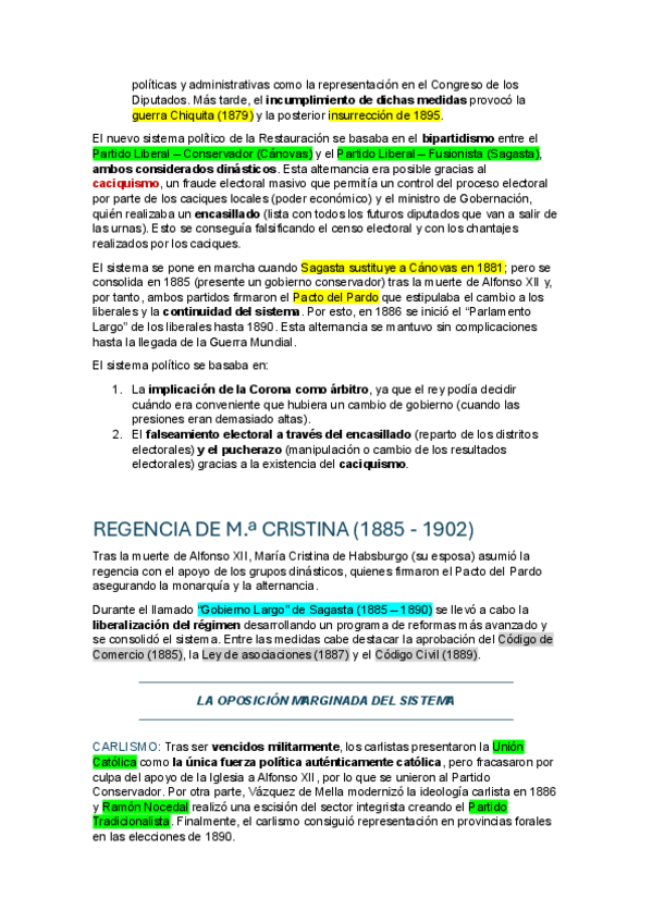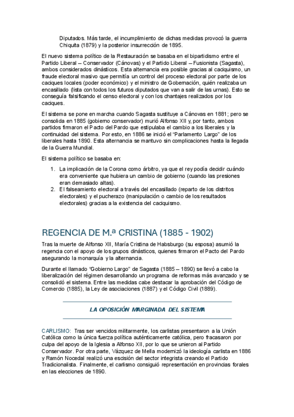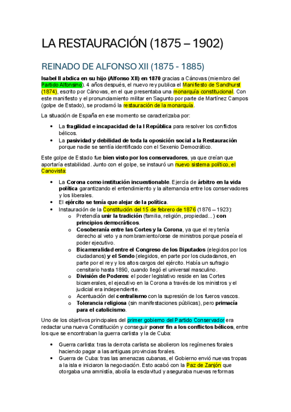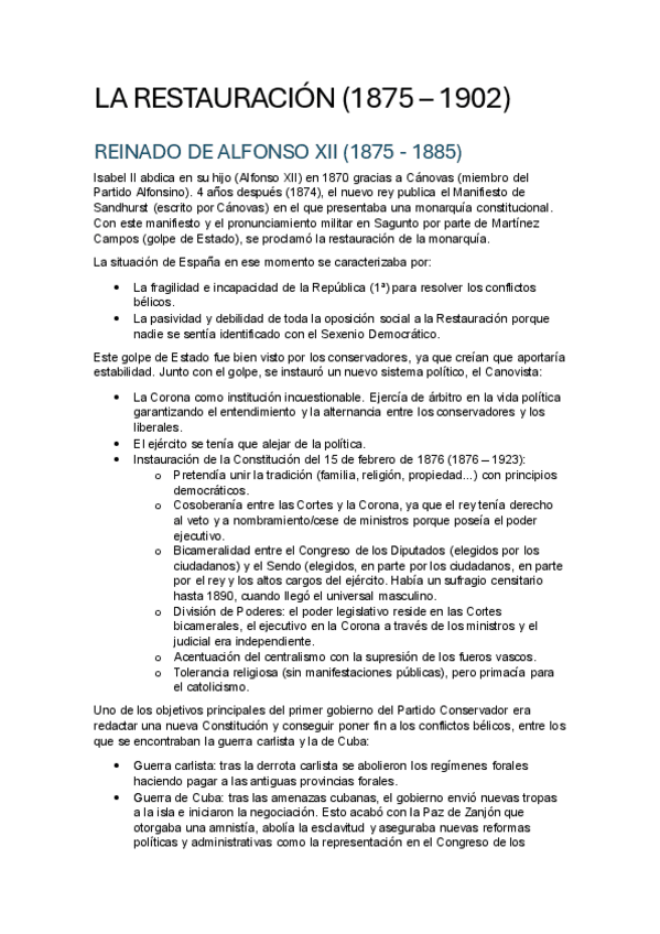 Apuntes de la Restauración y su crisis (1875 - 1902) realizados con el soporte del libro de Historia de España 2ºBACH de Vicens Vives.