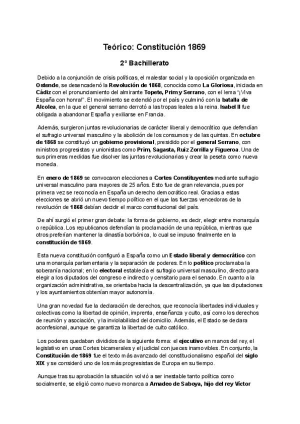 Contenido del teórico de la Constitución de 1869 para los examenes y para la PAU 2026