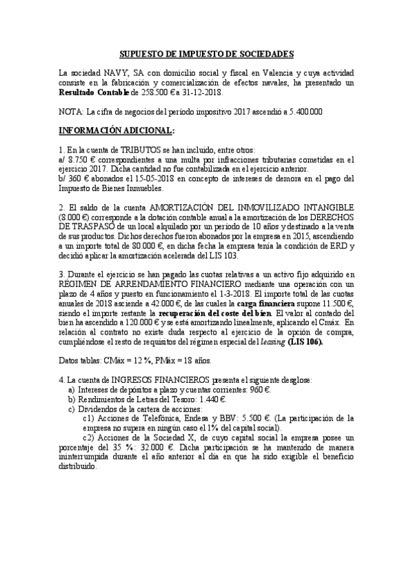 He publicado nuevos examenes de 3º Fiscalidad de la Empresa: SUP 15. SUPUESTO COMPLETO IS 2018.pdf