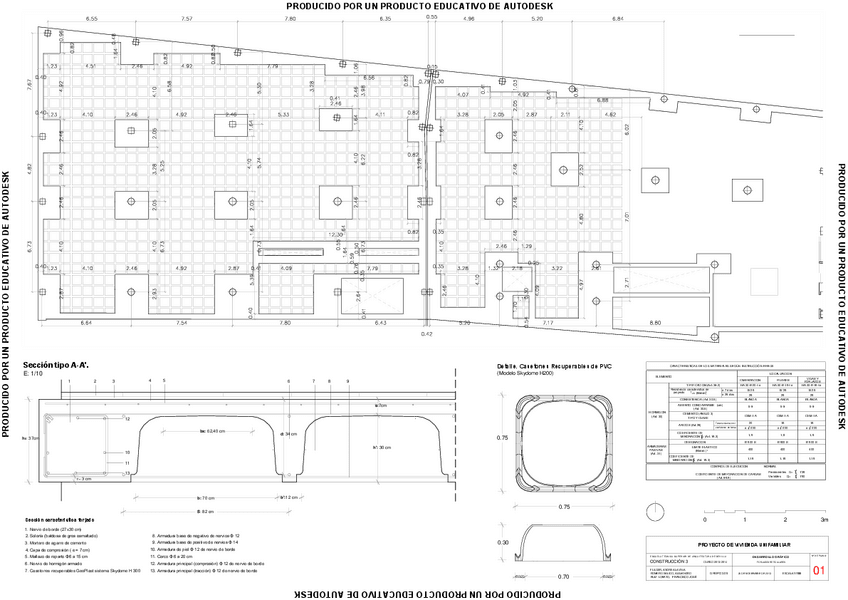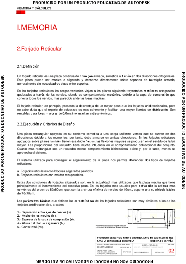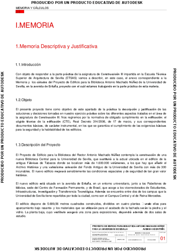 Planimetria completa y memoria descriptiva y justificativa del desarrollo constructivo Residencia de Estudiantes en Campus de Reina Mercedes (Sevilla). Descripcicon del Edificio. Forjados. Fachadas. Cubiertas. Cimentaciones y otros encuentros: Huecos y ca