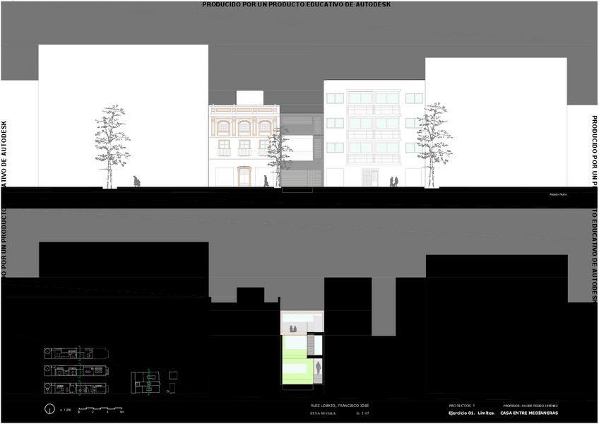 Plantas y Secciones-Alzados. Ejercicio 1 límites- Vivienda Entre medianeras. El Porvenir. Sevilla