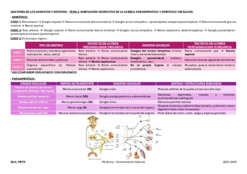 Esquema y tablas de resumen para entender y repasar el Tema 3 de Anatomía de los Aparatos y Sistemas: Inervación Vegetativa de la cabeza: Parasimpático y simpático cefálicos.
