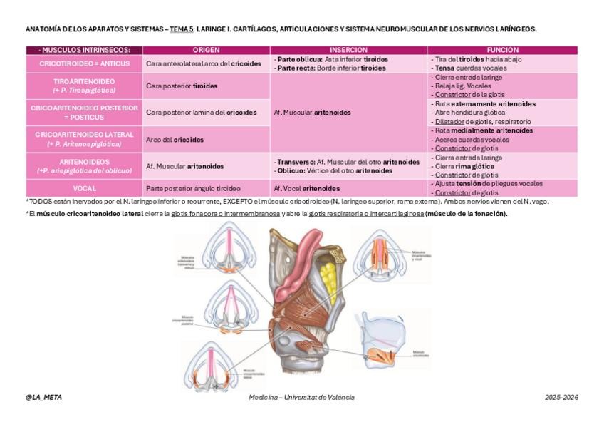 Tabla de los orígenes, inserciones, funciones e inervación de los músculos, con foto incluida, del Tema 5 de Anatomía de los Aparatos y los Sistemas: Laringe I. Cartílagos, articulaciones y sistema neuromuscular de los nervios laríngeos.