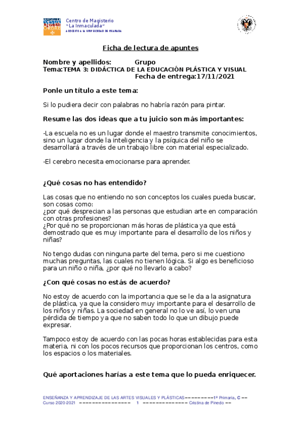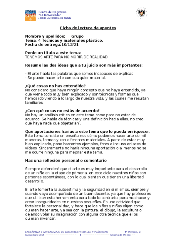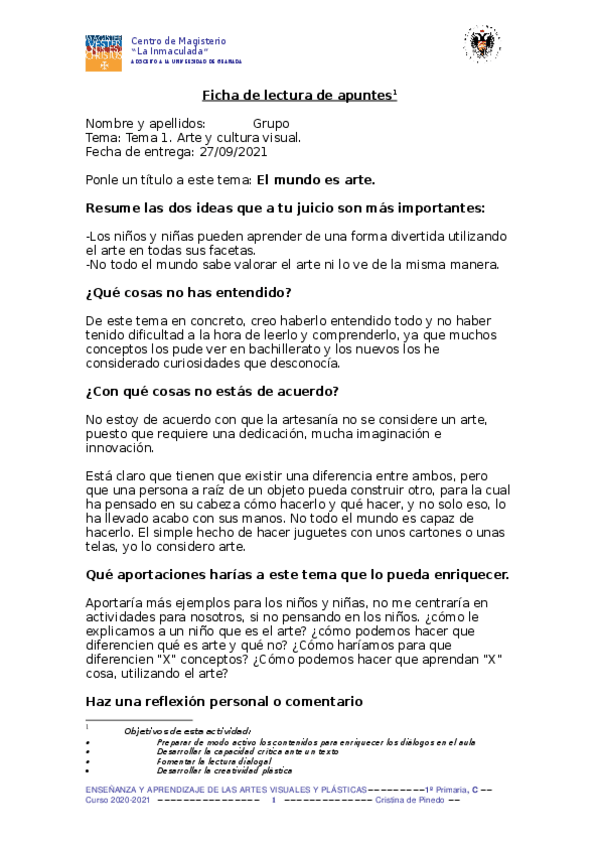 He publicado nuevos trabajos de 1º enseñanza y Aprendizaje de las Artes Visuales y Plásticas: FICHA-DE-LECTURA-1.doc