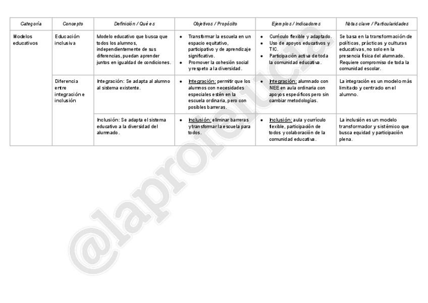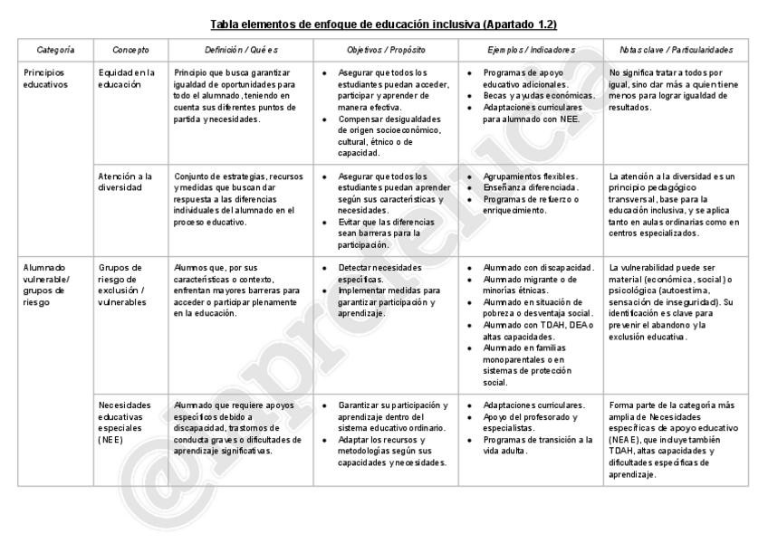 Tablas resumen sobre los siguientes apartados: - Apartado 1: Elementos de enfoque de educación inclusiva - Apartado 1.3: Evolución legislativa de la educación inclusiva en España y en el extranjero - Apartado 3.2: Normativa nacional y principales avances
